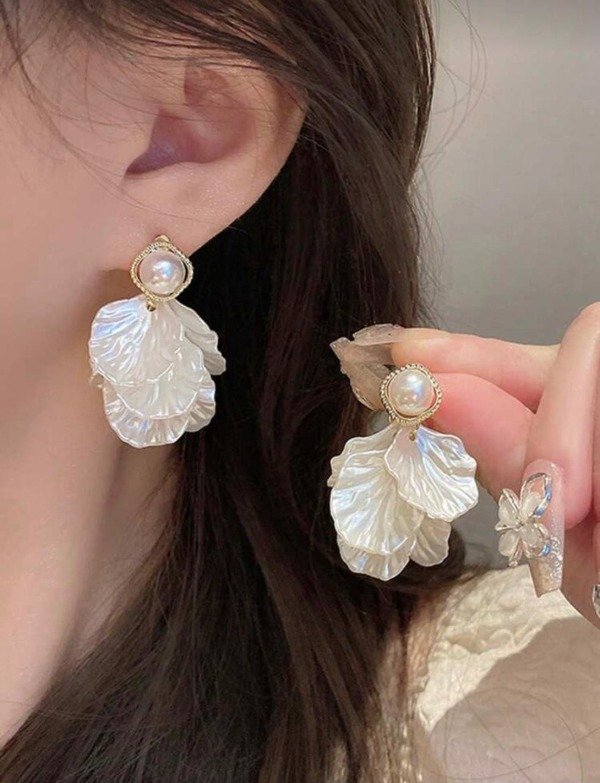 Finos aros de pétalos blancos con tope de perla engarzada con dorado. Tanto para eventos como para looks cotidianos
