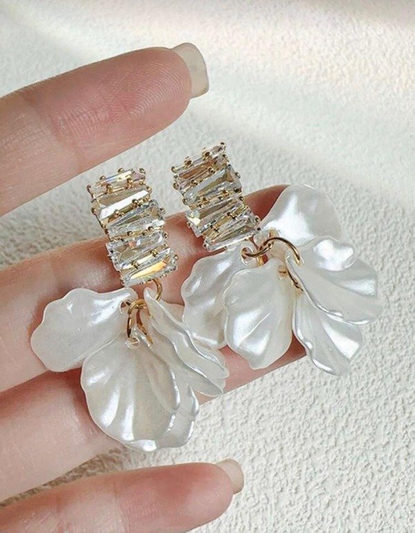 Delicados aros de pétalos blancos nacarados con engarces dorados de piedras