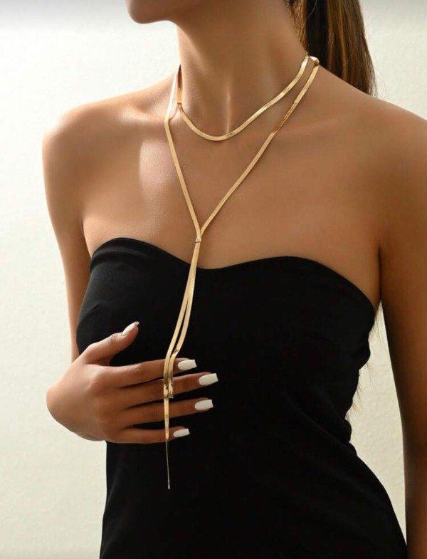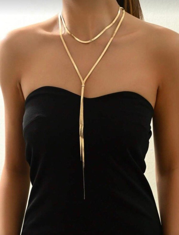 Espectacuñlar collar corbatero doble con fina terminaión. Idela para look escotado o para cuello muy cerrado.