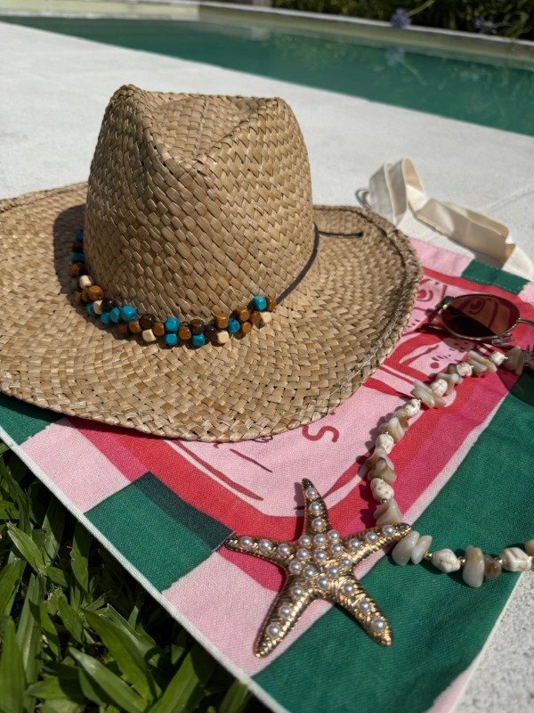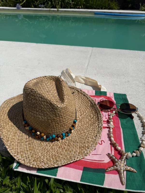 Sombrero color arena con decoración de piedritas celestes, blancas, marron.